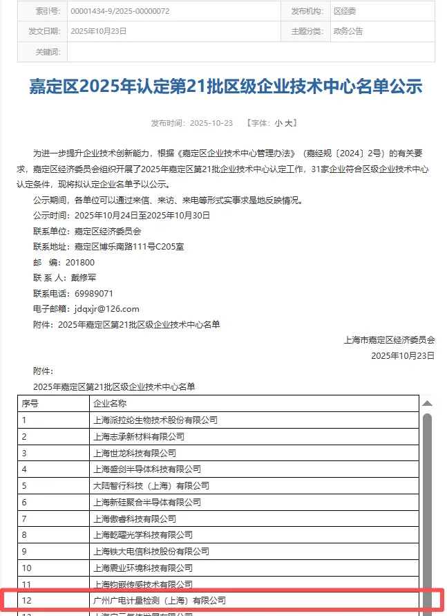 近日,上海市嘉定区经济委员会公布了2025年上海市嘉定区企业技术中心认定名单,广州广电计量检测(上海)有限公司(以下简称:上海广电计量)顺利通过上海市嘉定区企业技术中心资质认定。
